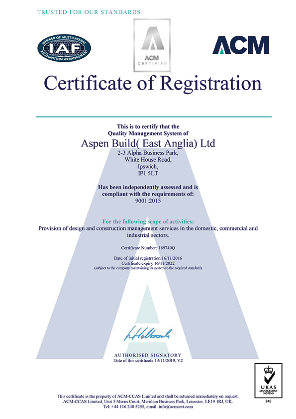 Aspen Build (East Anglia) Limited is pleased to have obtained recertification to ISO9001:2015 international quality management standard.